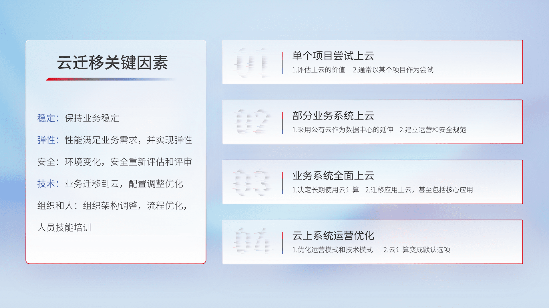 结合实际业务,,,从规划设计、、、云平台选型、、、云原生改造、、数据迁移、、、、集成交付,,,,迁移全过程为客户识别最佳上云路径,,,,做好风险识别管理,,,设计网络架构、、、身份权限、、、、安全审计合规、、、、操作审计、、、日志审计、、、监控告警策略、、多站点容灾设计等,,对云上基础设施进行整体规划,,提升IT治理水平,,以满足弹性、、、、高可用、、高性能的需求。。。