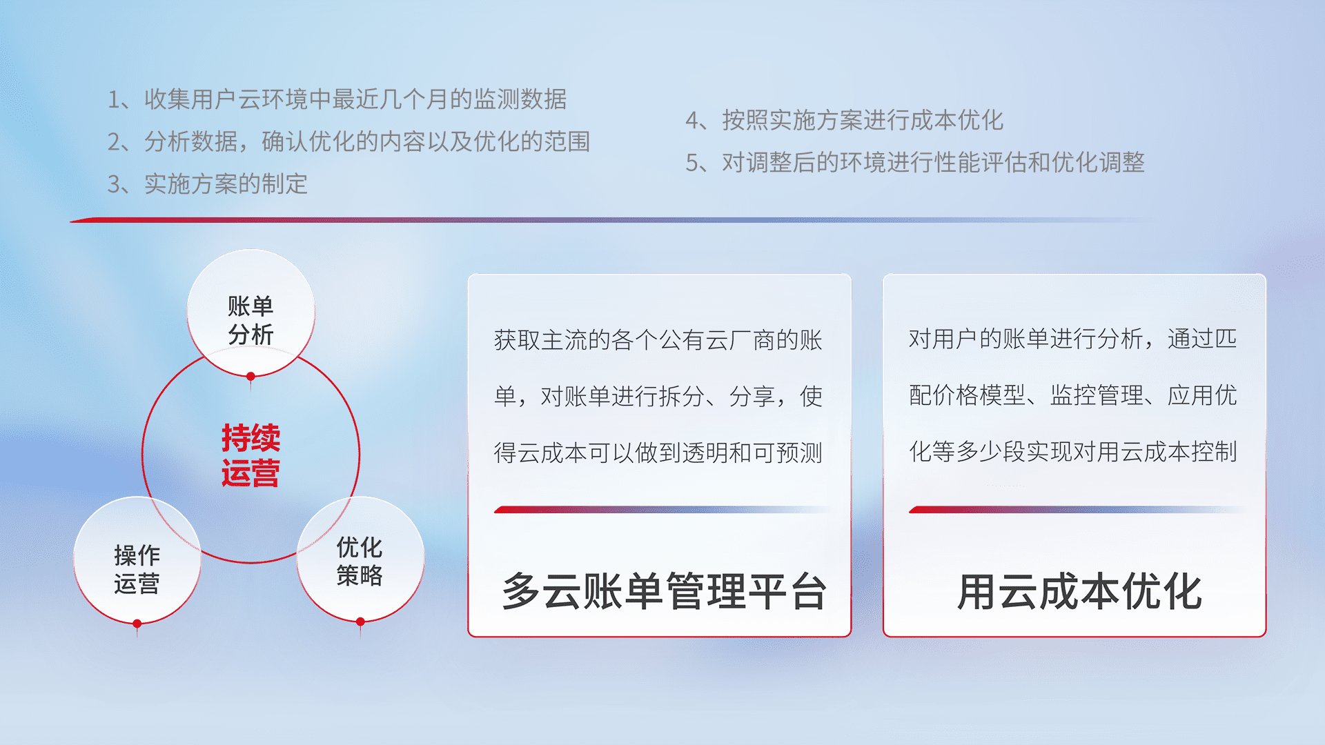 通过多云纳管,,,以统一的资源数据模型把客户的云资源进行抽象和封装,,进而实现对多云资源的统一操作,,保障云资源管理的可靠性、、、稳定性与可用性。。量身定制化运维内容,,,配置、、开发运维、、补丁管理、、、备份、、、、监控、、认证和访问管理、、、、审计和日常巡检等,,,,保障在用云过程中的可靠度,,稳定度以及高可用率。。